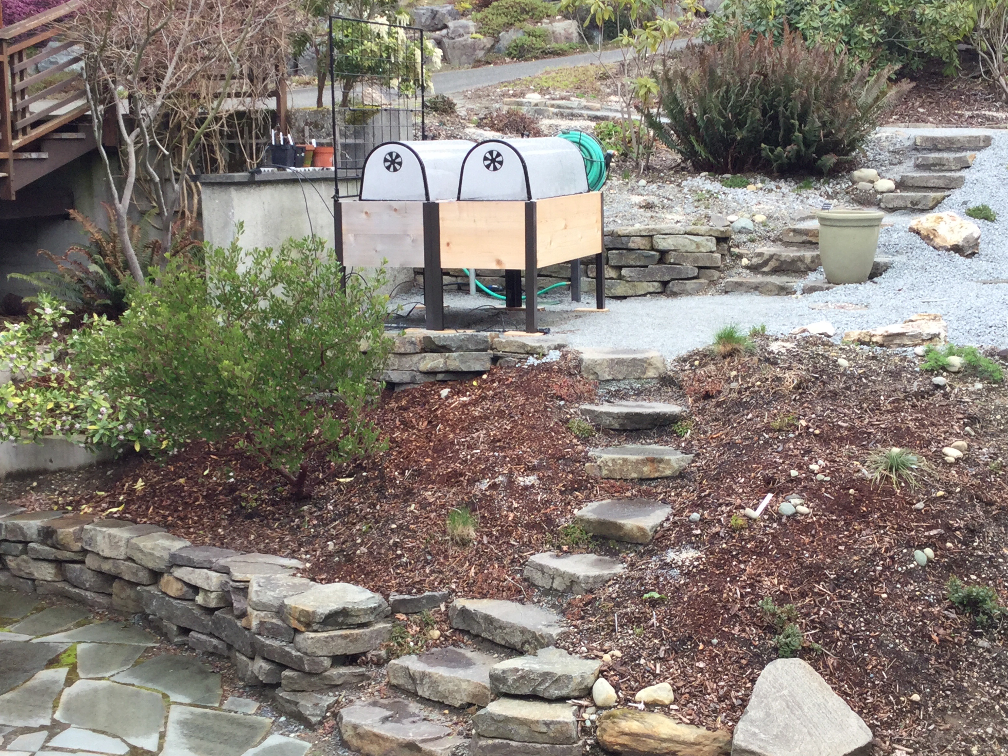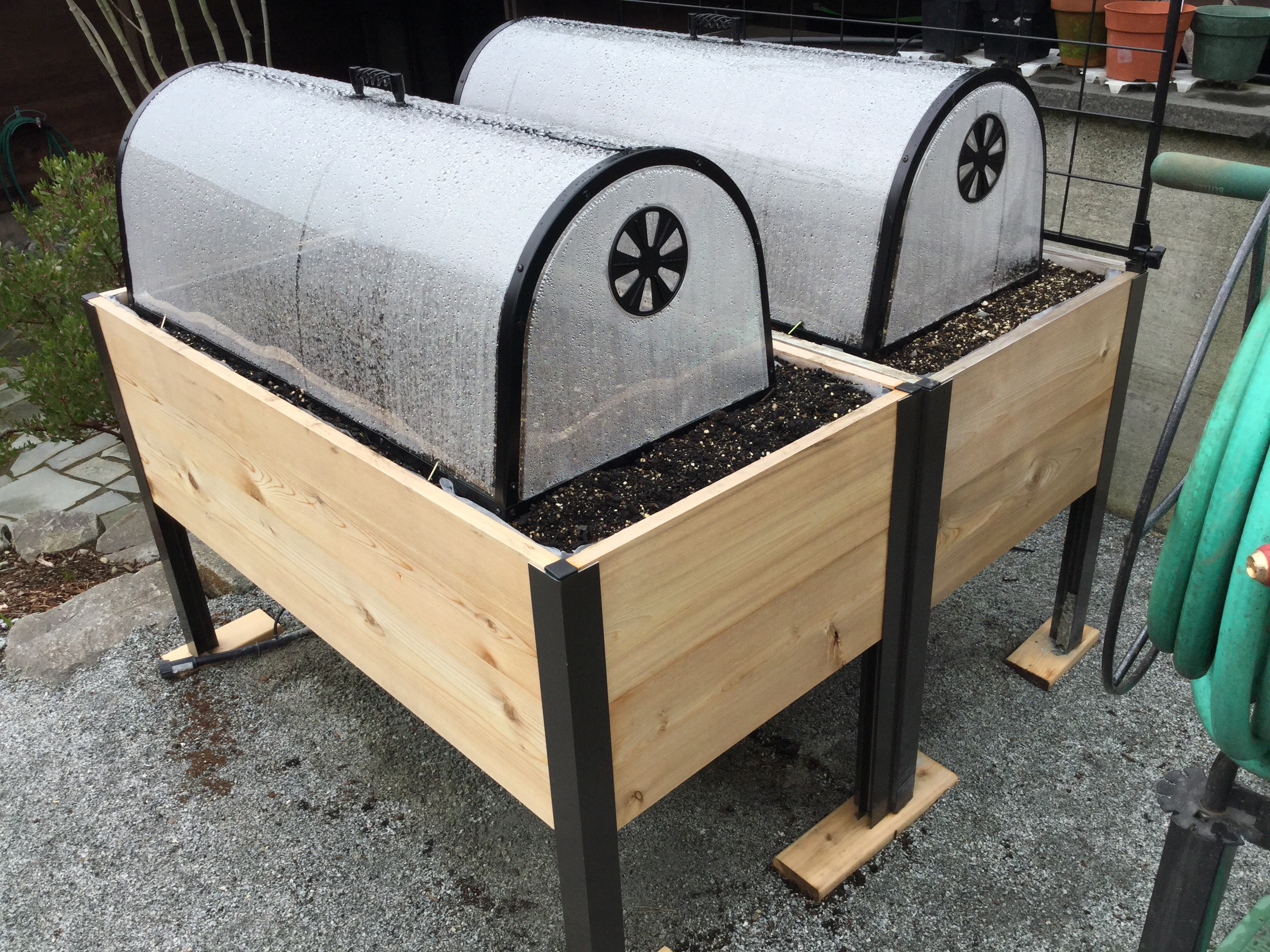 We bought two large plastic and metal cloches to extend the growing season and speed up some of the plants by providing warmth and protection from all the cold spring rain we’ve been getting and from sprout-eating vermin. Unfortunately, sprout eating vermin appears to likely involve deer now. We found deer prints in the soft ground in the back yard yesterday, and of course caught one red handed last fall, the first sighting of a deer in the twenty two years we’ve lived here. I didn’t want to bother with the fabric type cloches, those would blow away with our first good wind! Even these need little metal spikes to secure them. They cover most but not all of the space, but this works for an early planting. I will probably remove these cloches and plant along the uncovered borders when it warms up. Also got a square metal trellis that attaches onto one side of the planters for the bean and cucumber vines. Soil is potting soil in the back one from last year, and some compost, soil and peat in the front one (dave filled that one). I mixed in some vermiculite and fish fertilizer in each, especially the non-composted one.