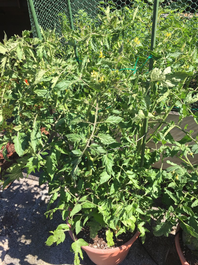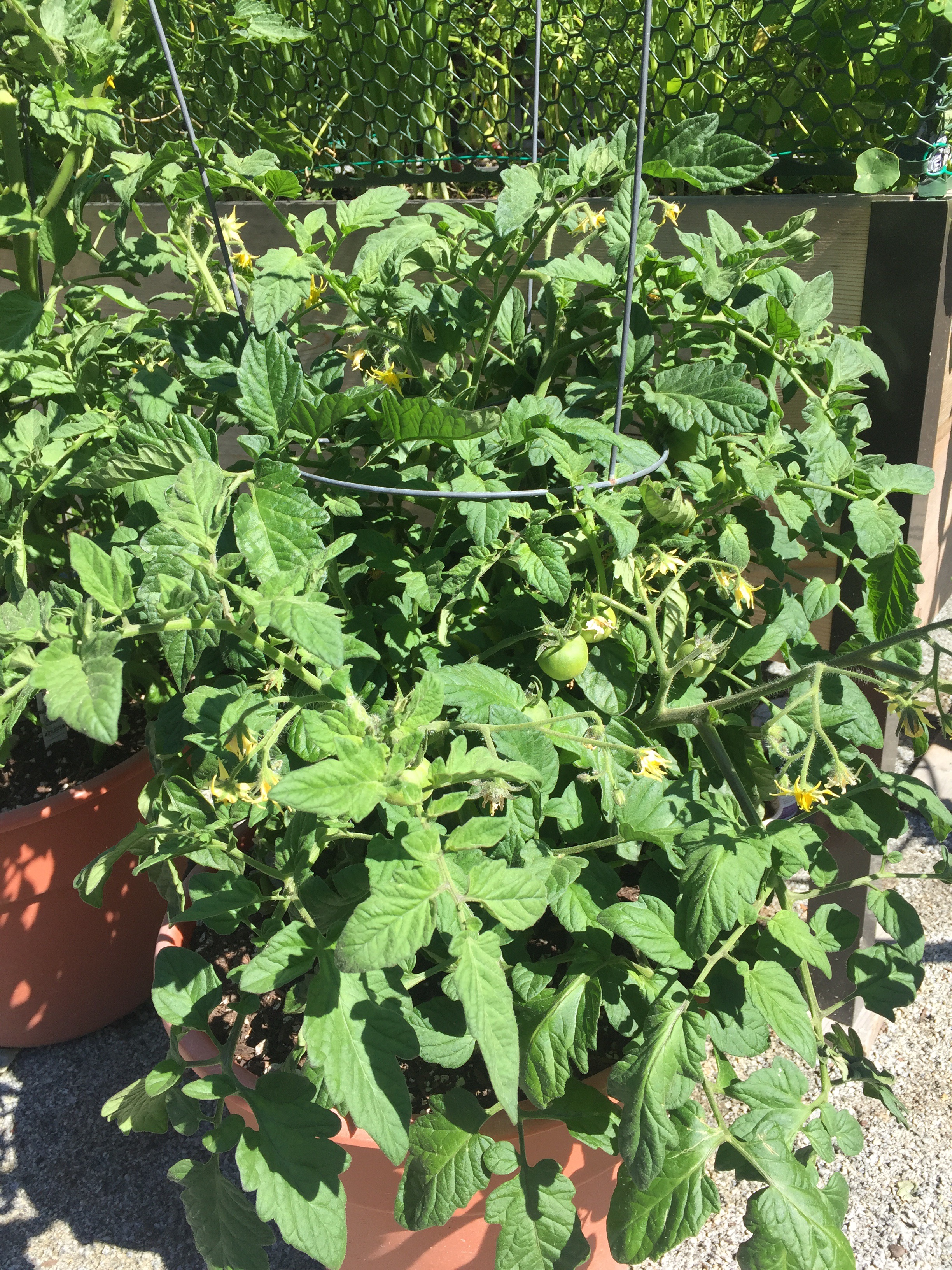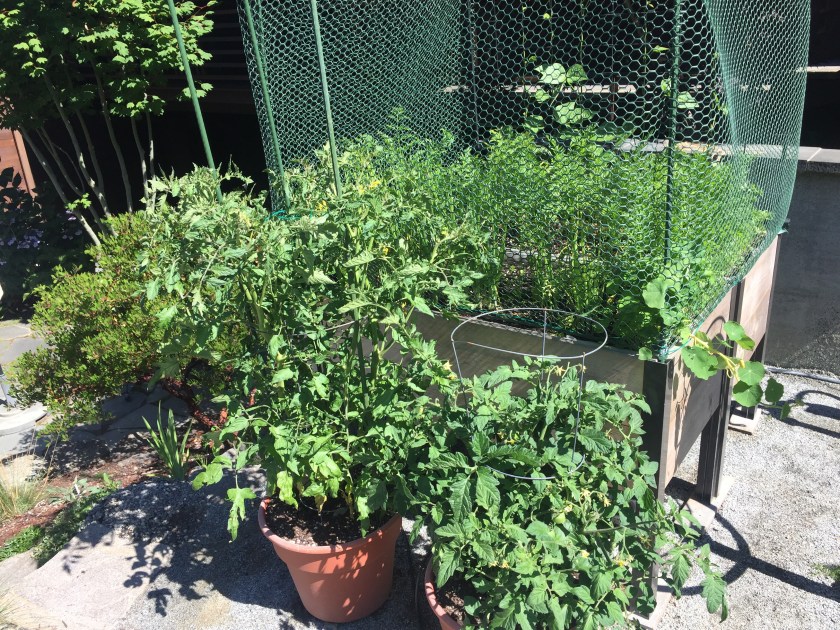 The real news is that the tomatoes finally look fantastic! Lots of flowers on both kinds, the larger Oregon Spring and the small Sweet Cassidy ones. The latter is indeterminate and is about 4 feet tall now, finally started forming flower buds before we went out of town. Ten days later they are blooming! We set up a great watering system with drips in the tomato containers and mini-‘sprayers’ in each of the raised boxes. We keep the whole thing under stiff green netting while gone, but I can’t keep the tomatoes in that anymore, they won’t form well and may get diseased. Now if we can somehow kee the deer off of them,,,,,