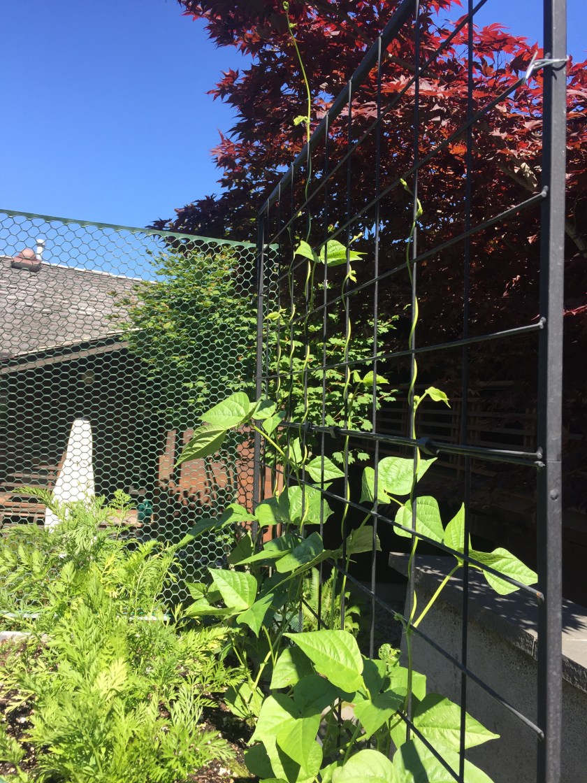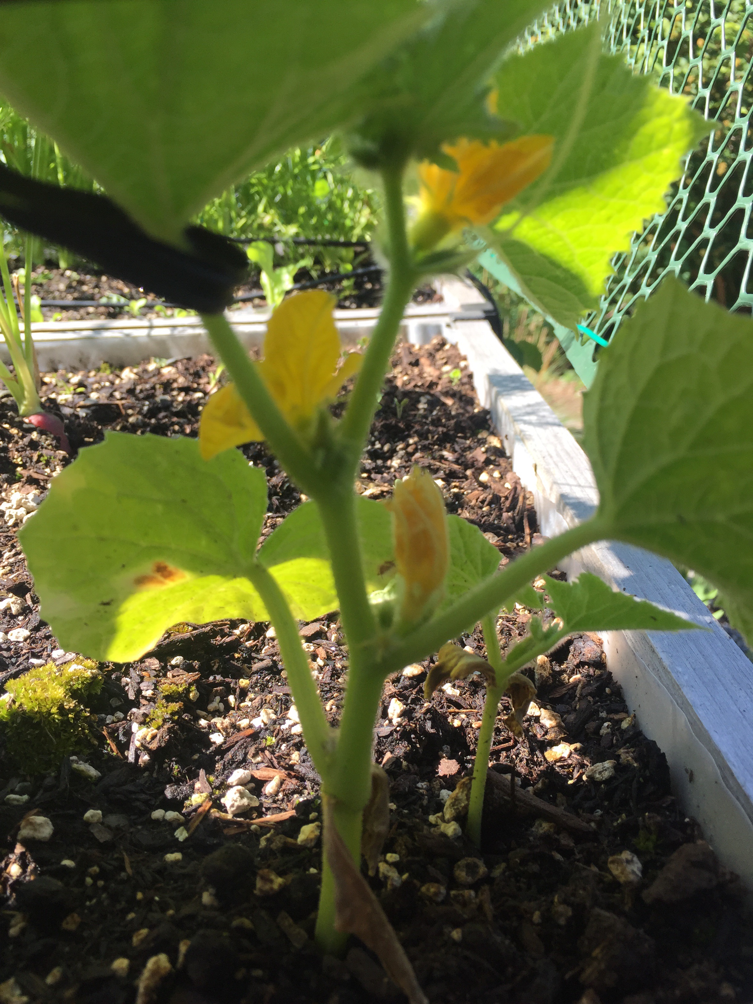 Broccoli sprouts coming up, about six of them, I almost forgot I’d sown them because they look like radish sprouts, almost pulled ’em up. They took about ten days to sprout. Carrots getting large, they are very sweet. Green Onions also getting substantial. Pole beans have reached the top of they trellis. Cucumbers flowering already, three on one, I’m trying to train them up the trellis first before they ‘trail’, because they are a “bush cucumber”, not the regular climbing vine type.