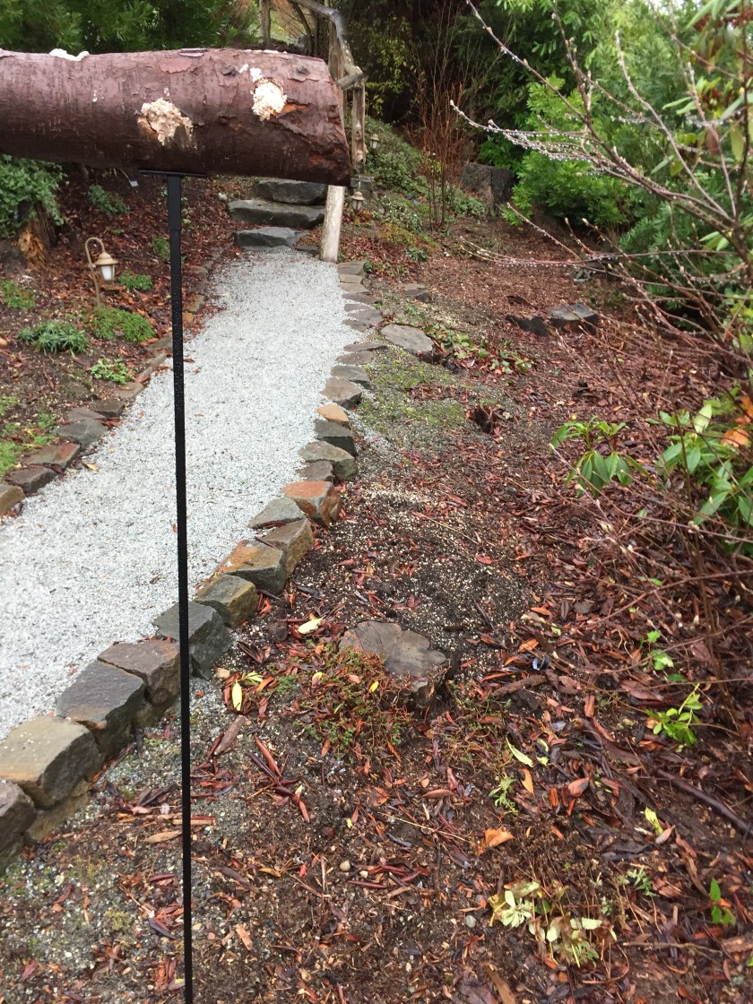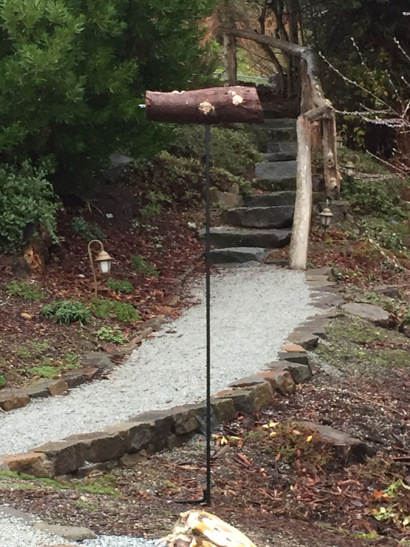 The wrens usually like this, but the squirrels do too, and one has already been scoping out his prospects. It’s supposed to be placed away from where squirrels can jump down on it, and they can’t climb the pole, which is about 5′. It’s a little close to small shrub branches, but can be moved if they are able to do that. We have it on it’s side right now to avoid swaying or tipping over from having it upright…..plus dave would have to even out one of the end first. Though that gives birds a flat surface to land on, and any type of larger bird could decimate it. We’ll have to keep an eye on it, I could rotate it if need be to move the holes away from the flat surface -if possible. There are no rungs or perches for larger birds, unless of course they are able to just sit down and gorge! The last feeder we had of this type was swinging from the deck in back but unbeknownst to us, we moved it away from where Mr Squirrel could leap down onto it but close to a ground rock, from which he LEAPED UP and got onto the feeder, then tore it apart.
