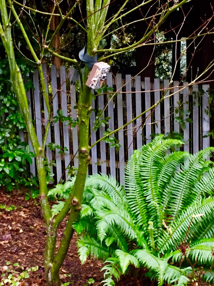 Pic of the Sceech Owl box we mounted in the backyard, on one of the bigger pines: