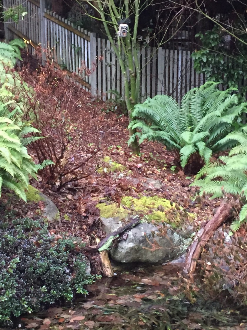 We reclaimed the 3 1/2′ x 30 ‘ north ‘bank’ of the dry overflow stream bed down in the backyard, by clearing it out of brush and having a border barrier put in around the salal/spires patch so I could plant without worrying about suckers. Transplanted Woolley Sunflower starts from the front, and small blue penstemon and blue flax from the back. Few random plants like yellow penstemon and Golden Columbine. Lots of room yet for seeds, probably a good place for most of the parsley flowered and sulphur flowered Buckwheat seeds.