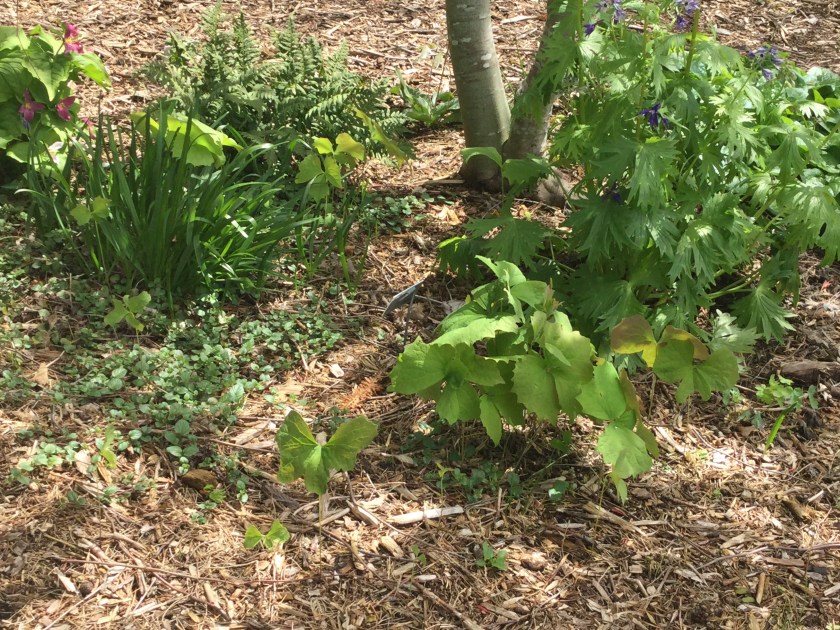 Also, have two new (actually 3 but one not planted) Vanilla Leaf plants, one of which has six leaves and looks great, in a new spot in the lower back yard. Another one had two leaves eaten despite a cloche, so I moved it, haven’t seen much come up yet but the stems I saw in the soil looked promising.