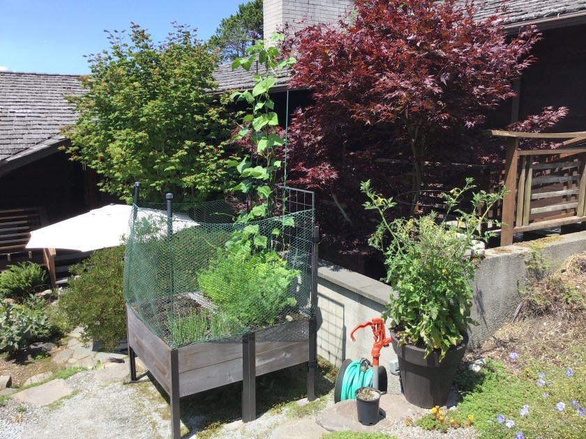 Some pix of the little container bed, the little veggie garden definitely not in its natural habitat but safe enough from deer and bunnies and seems happy enough with its prison. Though those beans, if they could talk. They do seem to be sending it a lot of leads, about three or so each now……