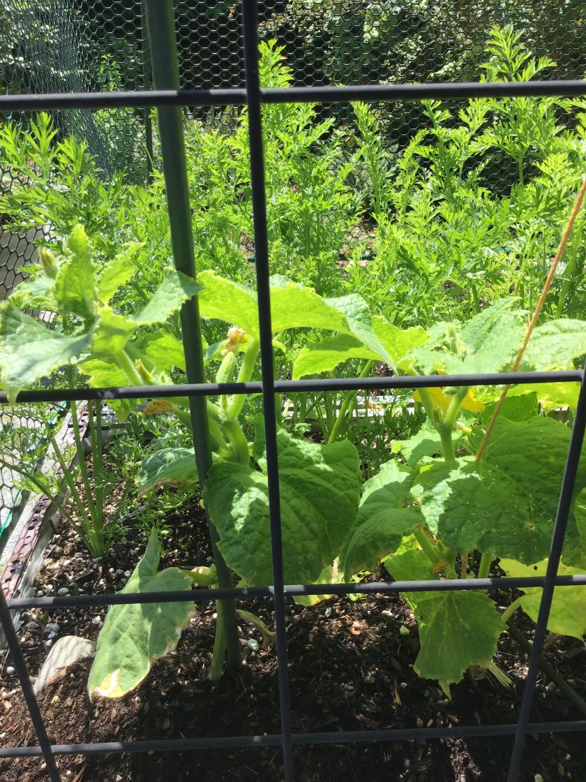 I feed all the plants with liquid Alaska fish fertilizer every two to three weeks which doesn’t burn plants. They seem to like it fine. Last year I think the beans were mislabeled and were actually bush beans, the only way to explain their inertia and ultimate failure. The beans actually pressed themselves to climb this year, and once they reached the tallest spot on the highest pole (they in fact are pole beans this year, it seems) they started out for nearby tree branches, the mesh fencing on the sides and each other. I’m thinking of finding a pole to plant in the middle of the planter bed for some of the other new strays that are bound to come along. Bean heaven. And they’re great stir fried fresh with a little Szechwan sauce, served on a plate with tomatoes, carrots, and cucumbers. Others on track….good carrot growth but no carrots emerging yet. Actually have a dozen or so cucumbers as flowers or developing cukes, that’s a first because they haven’t liked it here in two tries. If those turn out, and are also edible, I may actually try that brand again….who knew, though they are probably different sources than the icky brand from last year. Green onions doing fine but then they’re easy. I haven’t had the nerve to eat a bunch of native onions, but I have a whole lot of nodding onions that I could afford to try sometime. I know the native people here ate them.