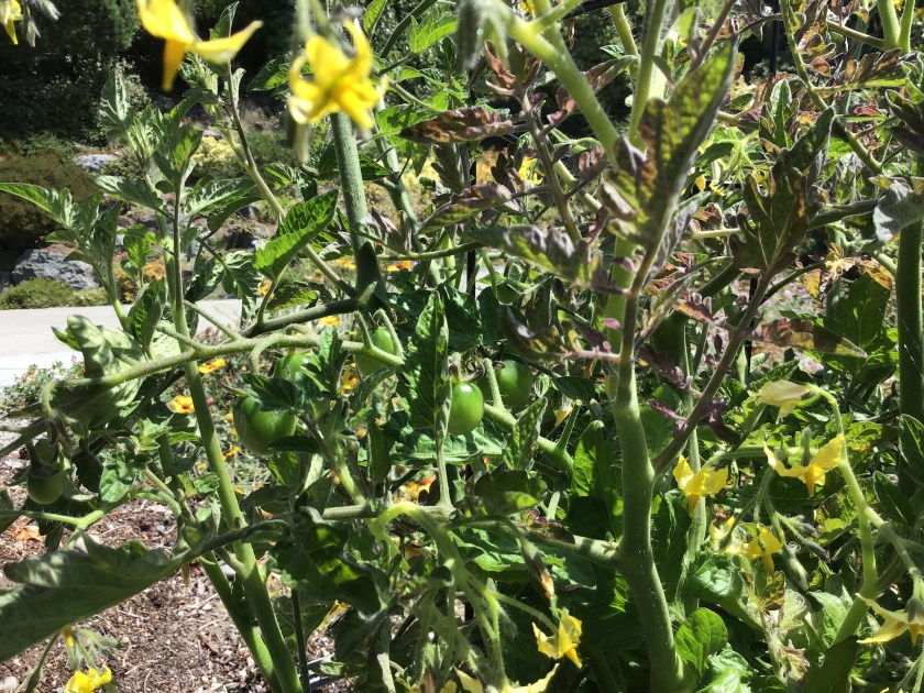 Tomatoes are stars so far this year. I found a deeper, 20″ pot for the tomatoes and only bought one cherry tomato plant from Sky called “Sweet Million”, as regular sized tomatoes never ripen in time. This plant seems to have a good upright habit with strong stems and I haven’t had to train or tie them to the cage. I also haven’t had to address and mites or other pesky problems that were probably related to too small a pot. Tomatoes have deep roots, and you’re supposed to bury most of the stems of the start, which is hard to do when the pot is too short. The start had a small first spray of flowers which I took off because it was too early….the plant wasn’t tall enough. There is concern that nutrient resources would be diverted to flowers during crucial plant growth time, but I’m not sure there isn’t also a chemical feedback system that is affected by early flowers, which could result in a shorter or ultimately less productive plant. It would make sense, given the sophistication of the plants world, we’re finding. Of course, have I looked that up or done any research other than think about it? Not yet, but I will, and you just KNOW I’ll have an update. Now there are tons of flowers and developing tomatoes, some should begin to ripen I would think by the end of this month. August and September should be good tomato months!