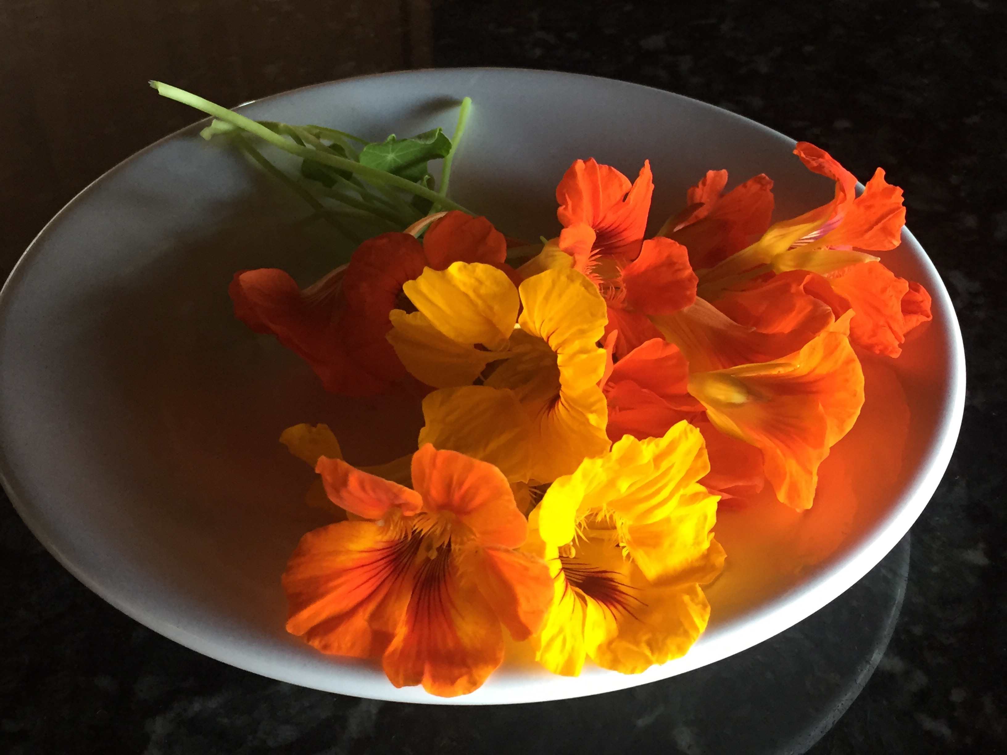 Have been getting great nasturtium flowers for vitamin C, plus great peppery flavor. I had six sites in the planter bed, so I took most of them out before we go out of town for a while, also to let the adjacent carrots and onions get some sun, leaving two plants. They are very floriferous. I always eat a bouquet full of flowers. When I cleaned out the planters, I made a great salad  of all the nasturtium flowers and buds I’d taken out, a fat carrot, two small onions and some olive oil vinaigrette. Yum.