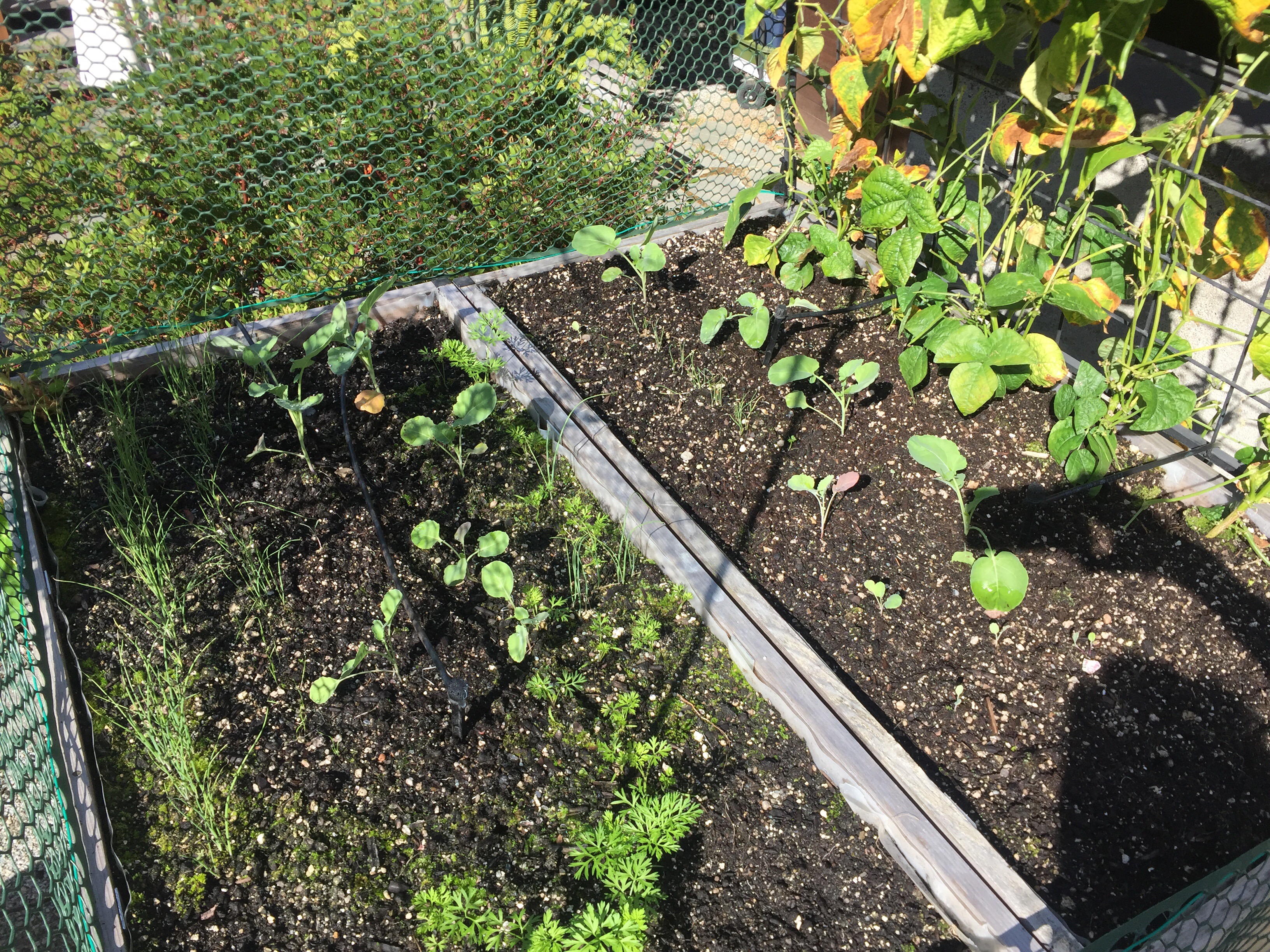 Finally pulled the second planting of “failing lettuce” and planted new carrot and onion seeds in their place, which are just coming up this last week. So now I have three different ages of onions and carrots, established pole green beans that keep trying to grow above the six foot or so trellis getup, and ripening tomatoes. We have had a few of the Oregon Spring ones already, but the Sweet Casady are just starting to get red. New seeds planted today for recently removed carrots, too – I targeted the ones on the south because they are blocking sun from seedlings. The carrots get huge, by the way…almost all of them are quite fat, some are double, and I think they can’t get more than about 10″ long because of the depth of the planter box. They are more tender and tasty than the store bought, as are the onions and green beans.  The broccoli is still in seedling phase. The cucumbers were a bust, next time plant only vine cukes and only on western side.