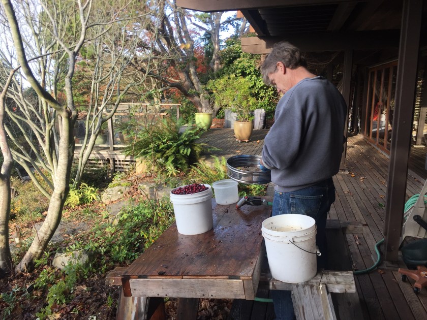 Deer rant: Of course deer can “jump” the fence, but there’s not much reason to do any jumping, plus these are arranged in circles. They’re meant to divert the deer around, preferably back to the path. Good thing most plants were dormant when all that rutting was going on! (See previous entry from December).The ground was full of deep hoof holes, that’s one reason for the extra fence circles. I’m also not sure they would have completely respected the fence borders during the rutting, but we’ll see next year. So far after a month, no disturbance of the four fenced circles or new hoof holes within them. One fence has been undisturbed for three months. I also put 5 bronze metal cage cloches on a few new huckleberry and their plants that the deer ate down to the ground, to give them half a chance (the sixth one of the set helps keep the flickers out of the suet feeder, though the songbirds did need to learn how to use it).