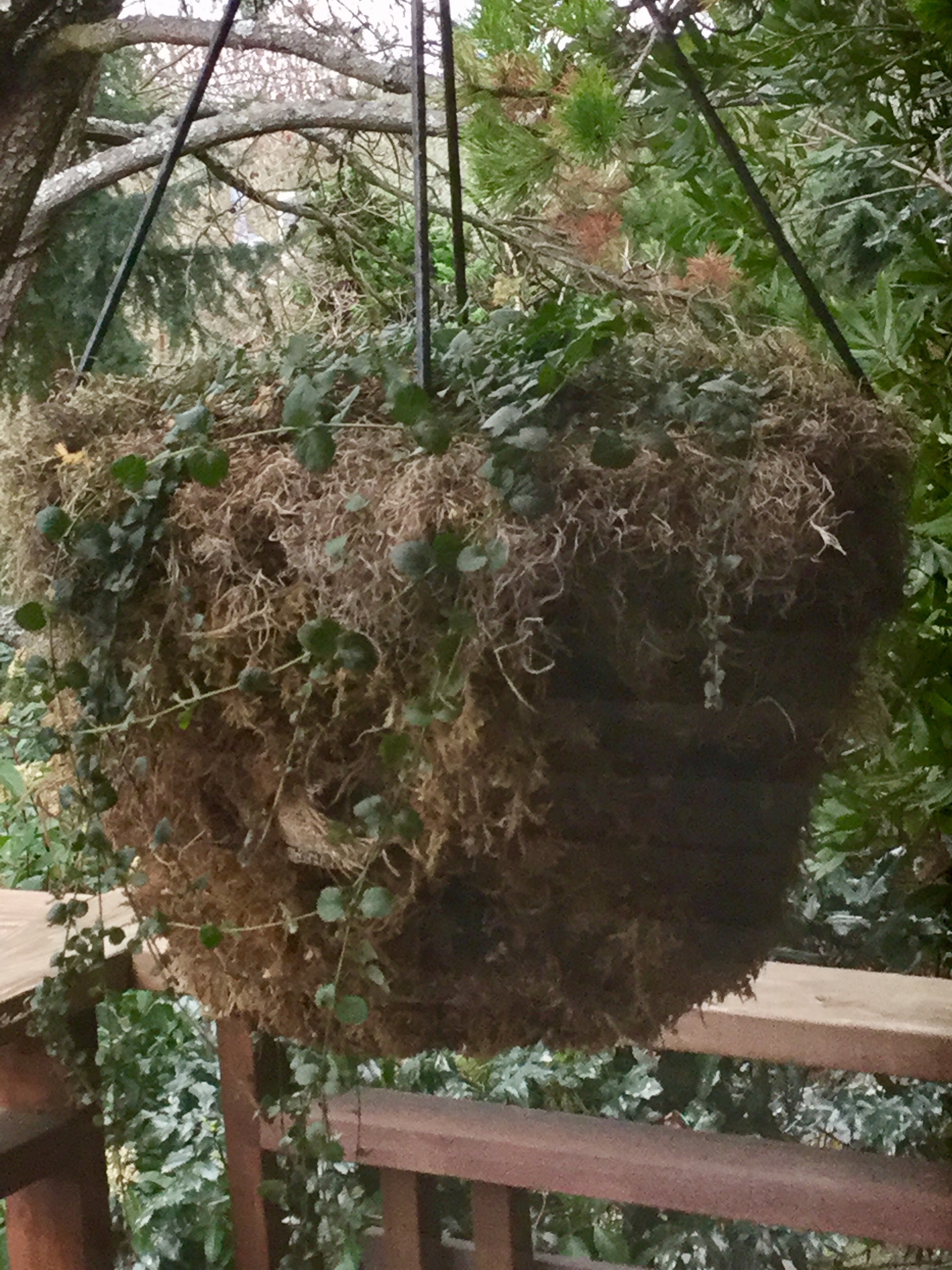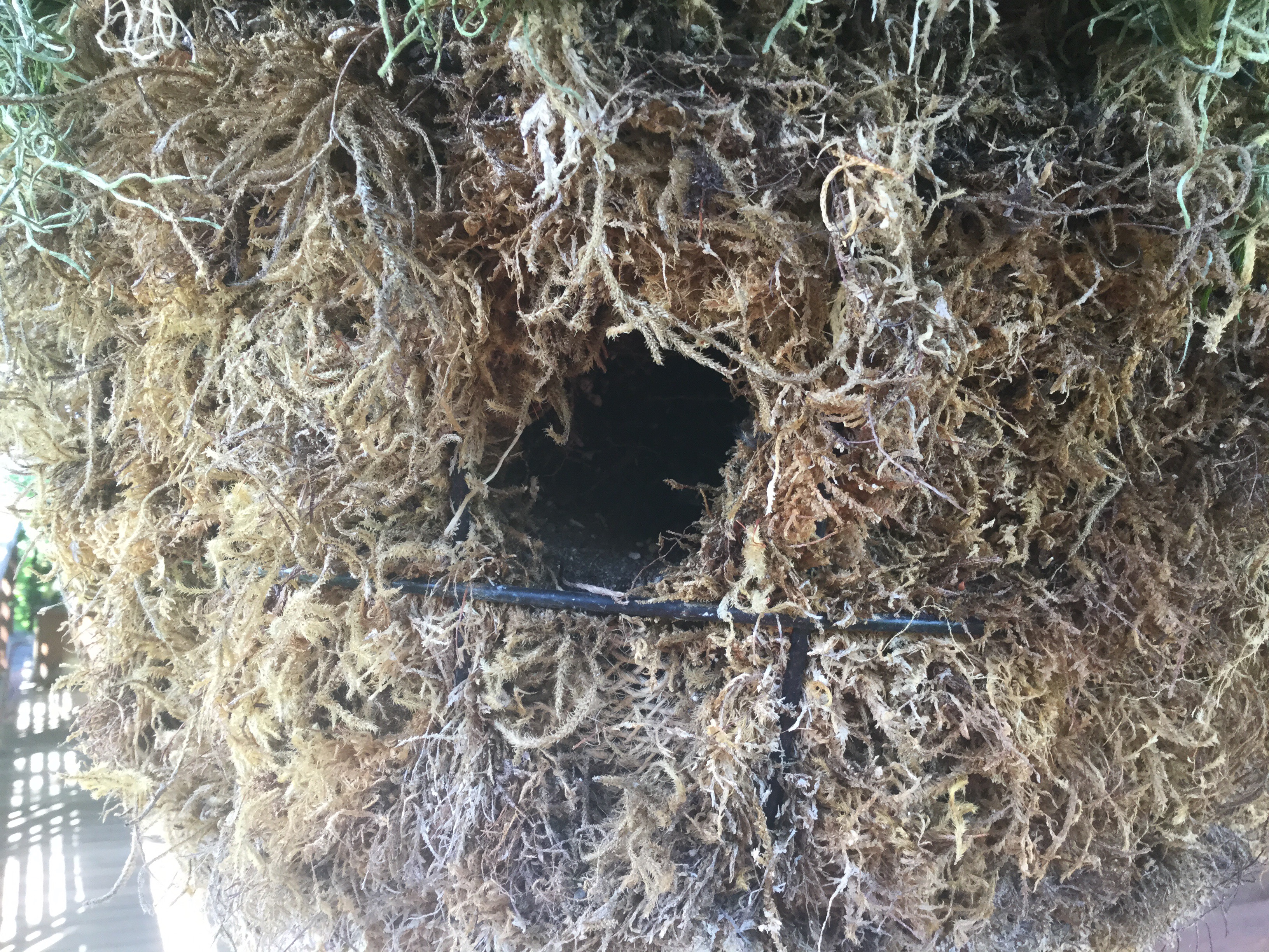 I recently rehabbed these planters specifically for the wrens, and shored them up with new moss and burlap but made sure to avoid damaging the wren holes. I added garlands of Spanish moss wired along the rim, topped them each with extra soil and sand, and planted Yerba Buena vines, which grow better than most things there. When I water the plants, the water seems diverted around the wren holes, so they might be sealing them.  Below are pix: