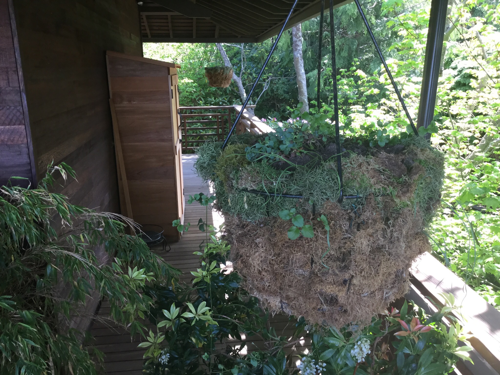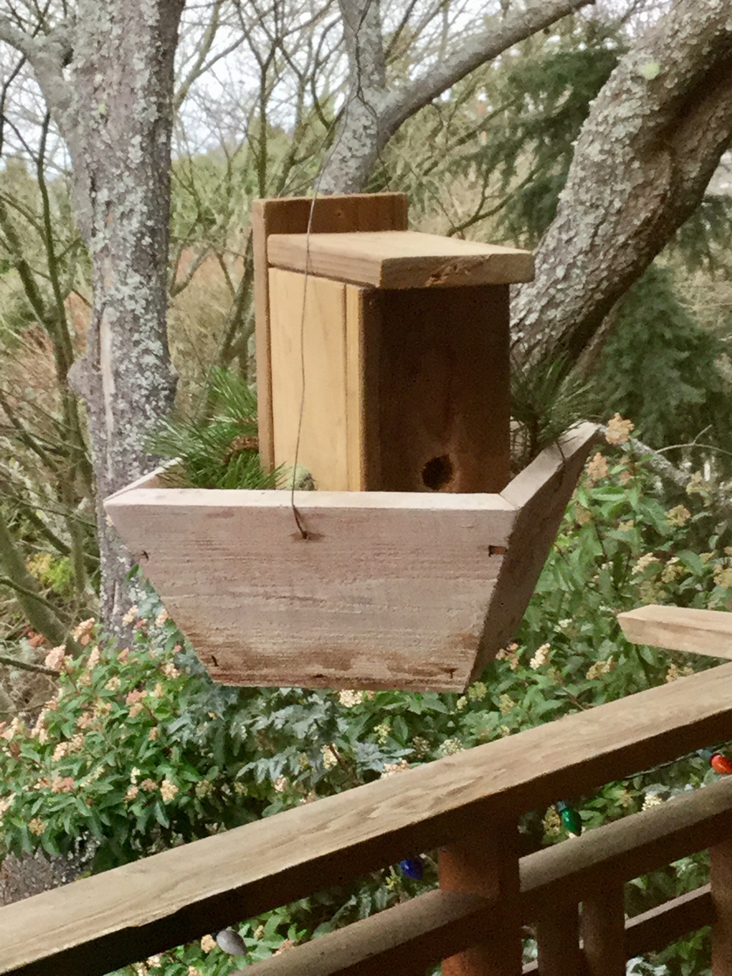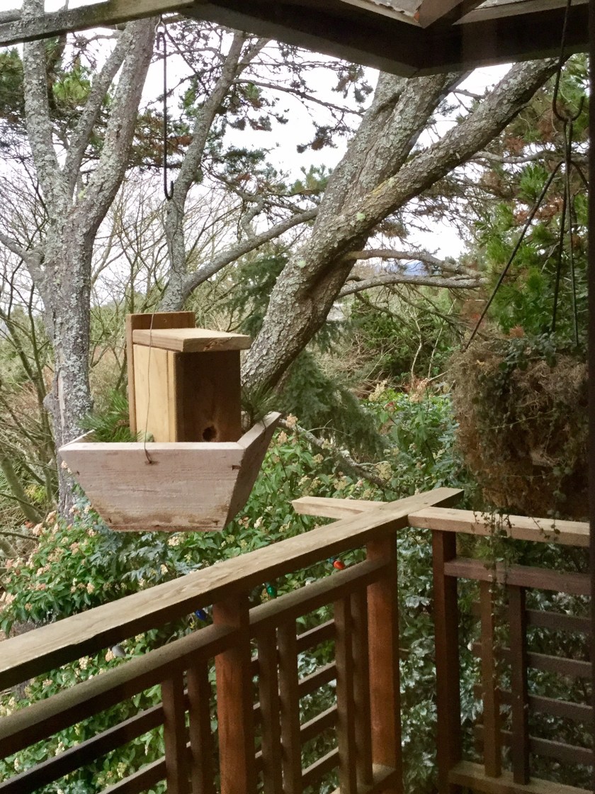 I placed the box on top of the dirt and used the planter box as a device to hang up the Roosting Box in a stable protected environment. In fact, it is about 3 feet away from the northwest hanging basket, a site they chose on their own. The new box is hanging from a wooden attachment to the overhang, then two wire hanging parts that I hope will help keep the rats out. I won’t have any food there and they won’t nest there. So, wrens, it has been hanging there 36 hours, time to wake up! I know you are out there cuz I saw you….!.