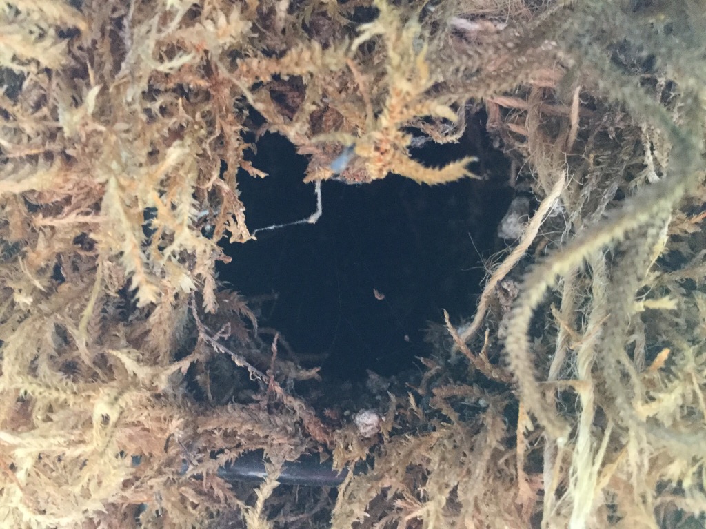 At least the wrens and maybe chickadees. The wrens have long commandeered our three hanging baskets for their hostels to sleep in overnight, except for when they are nesting. These are perfect shelter in that they hang just under the roof of the covered deck, and are heavy so they don’t swing in wind. Being within deck territory, they are predator-free. There are 3-6 holes in each which are about 1 1/2 ” wide  x  3-5″ deep, horizontally oriented into the planters, dug through the moss,  burlap and soil in the planter, to make individual little lofts. A couple are a little bigger, maybe they hold three or so.