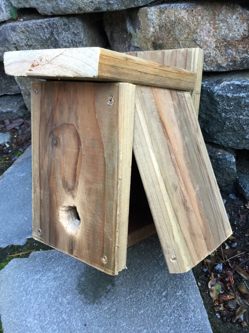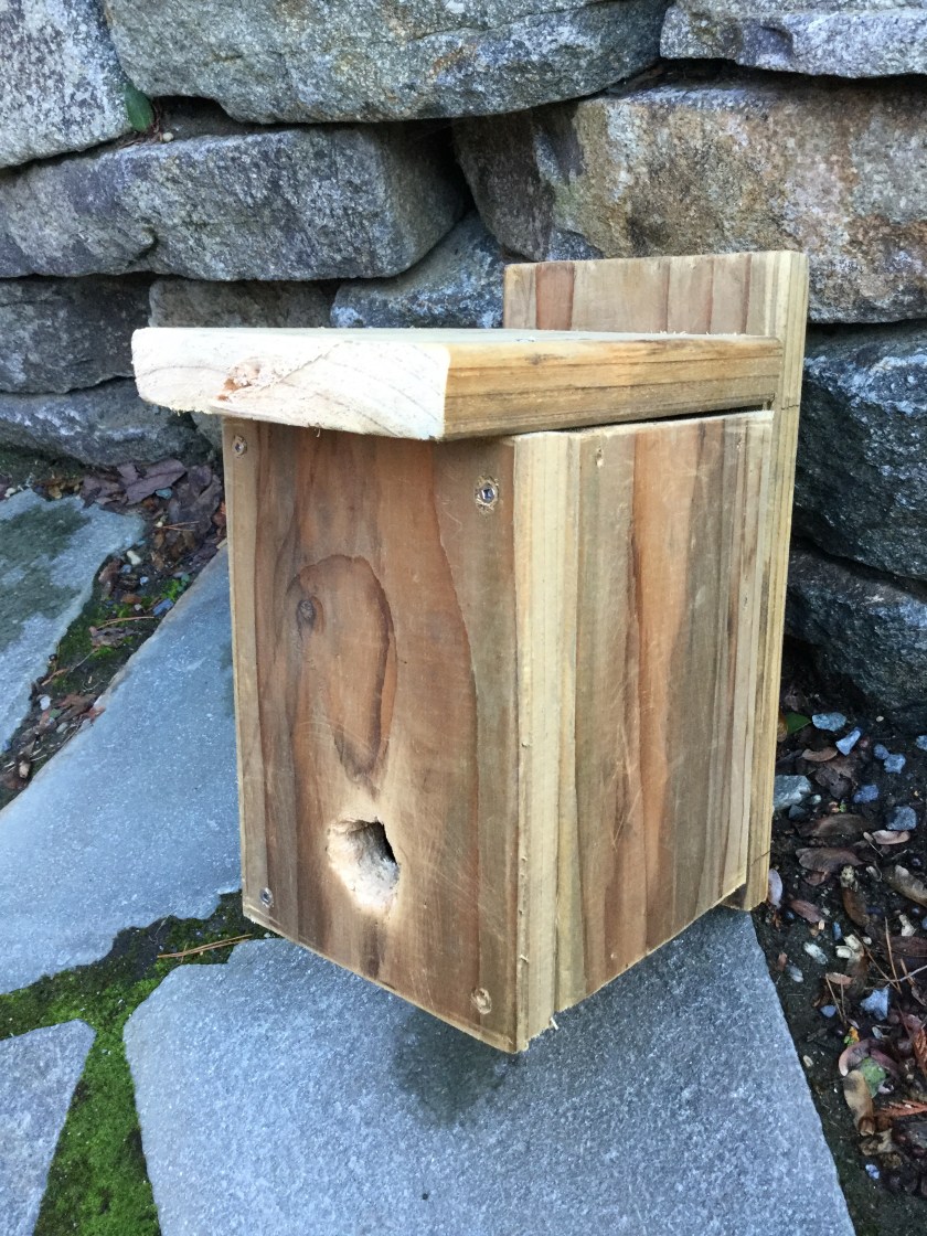 So I made a ROOSTING BOX for the wrens, wth provisions for possible chickadee use. The specs for these birds are 1 inch thick walls, 4 x 5 1/2 inches base by 8 inch height, with overhanging roof.  One of the side panels swings out a bit for cleaning, secured during use by birds. Right now, I left it unsecured so I can figure this out. Roosting and nesting needs are different, so there is a twice a year clean out and modification for nesting purposes.