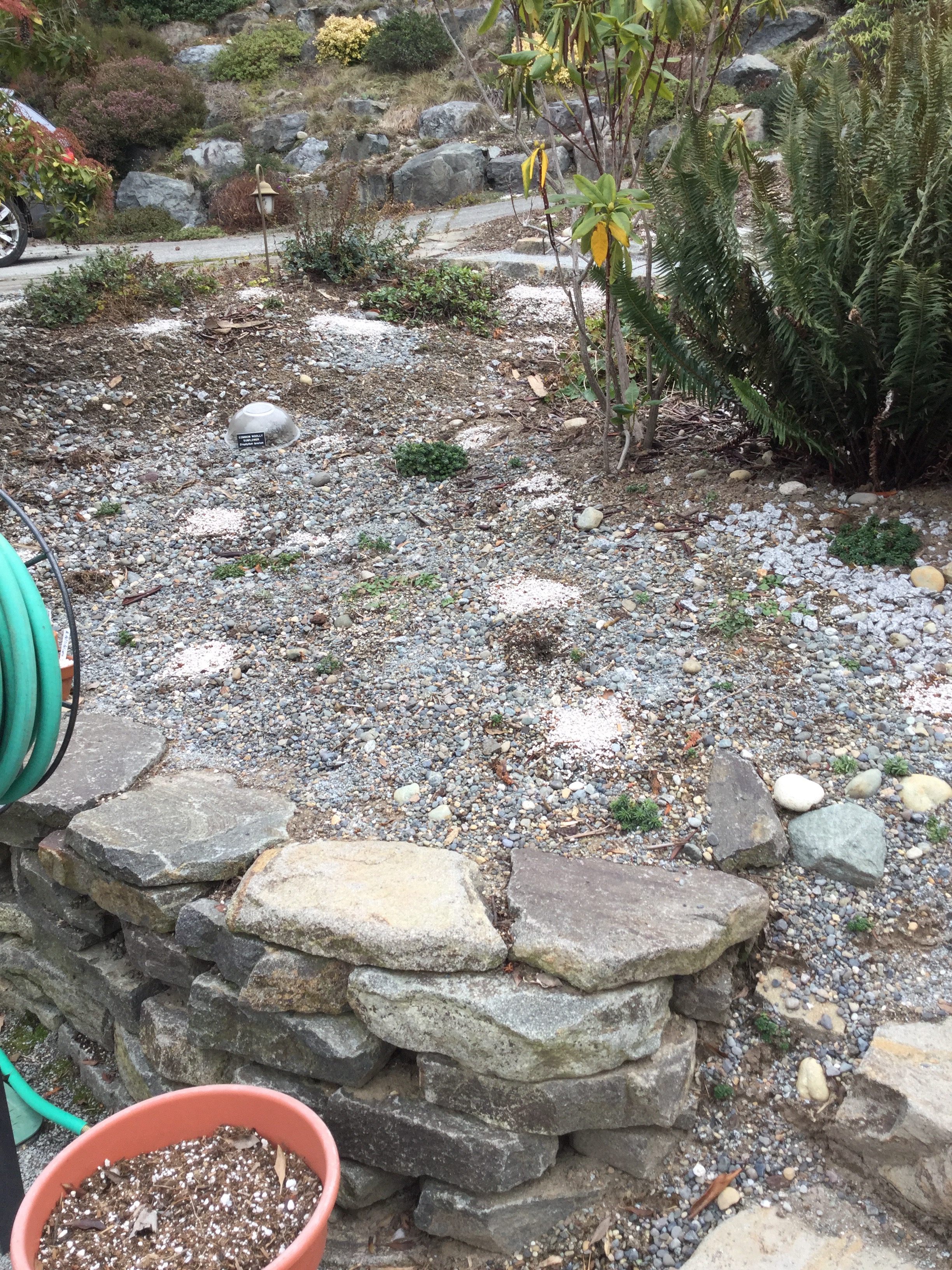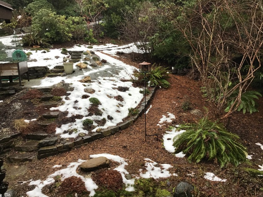 Plants poking up only include the usual, the light blue camas and the brodiaea. Few trilliums are also just visible, but they usually don’t do much for months. Lots and lots of patches of Pumice, which I placed on top of every small patch of seeds or bulbs that I put Everywhere:
