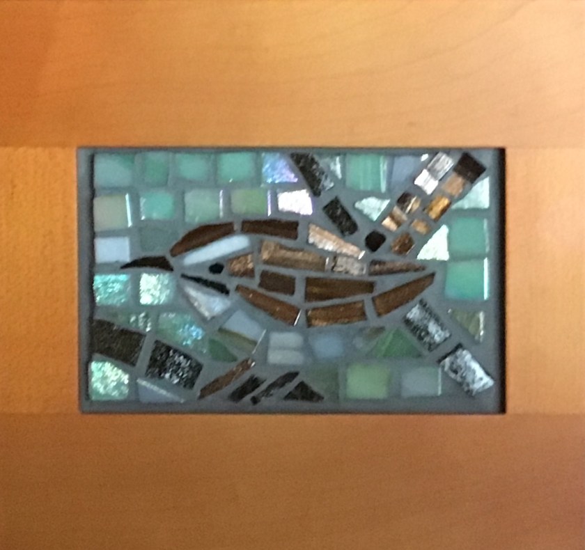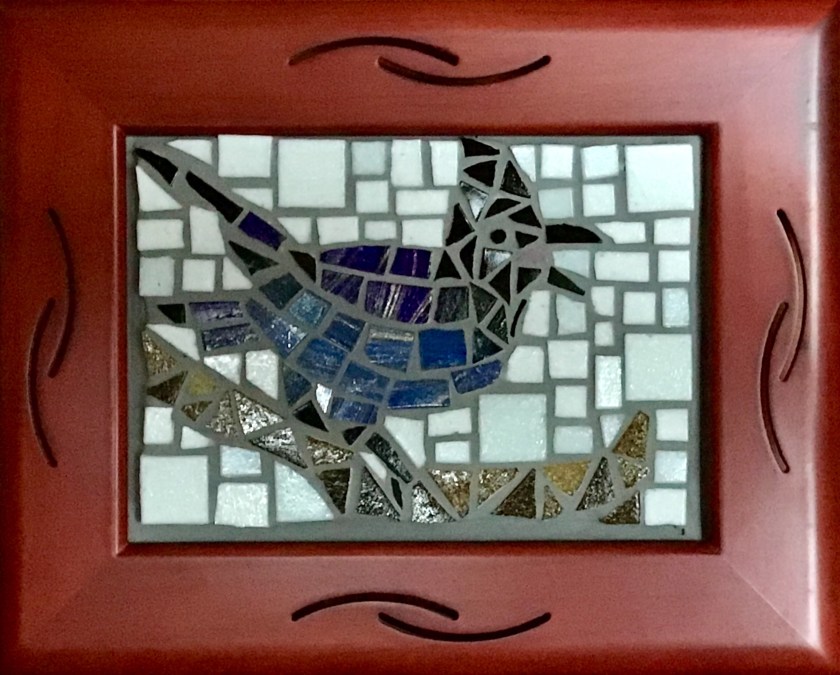 Repurposed several photo frames from the last few decades to house new little photo-sized mosaics of birds. We don’t have much room for photo displays around here- they collect dust on countertops and then eventually sit in a drawer. I made four but only finished glueing three, since one needs some serious sanding to make it centered and is not that great. They are small, the wren is 2 1/2″ x 4″, the largest jay is 4 x 6″, the woodpecker in between. Anyway, here are the birds in all their glory: (looks like I need to clean a woodpecker tile)