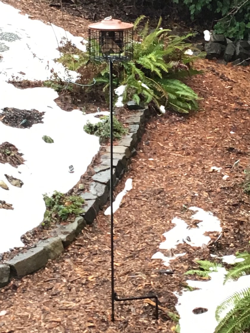 One reviewer didn’t, but they posted a picture with their feeder fixed right to the downspout, giving him lots of opportunity to wriggle in. I looked it up – the squirrel skull is apparently 1.4 inches in width (3.5cm), smaller than the feeder hole sizes of 1.5 inches. The skull height is almost 3 cm, so there isn’t much wriggle room for a squirrel who’s in mid jump or swinging around to get his head and subsequently his shoulders maneuvered in, but a fixed feeder with easy access would eventually be overcome. Above is the feeder we got, in a temporary spot…..it is also supposed to keep the flickers away from most of the suet, which it should be able to do. I don’t plan on putting in two cakes of suet, but rather 1 or 2 suet logs, placed more centrally so the animals that can’t fit into the “feeding space” can’t get to it. I started with the capsaicin logs I still have, but have better suet with buggies in it as well as peanuts. I’m planning on putting that in later, to drive the squirrels NUTS!